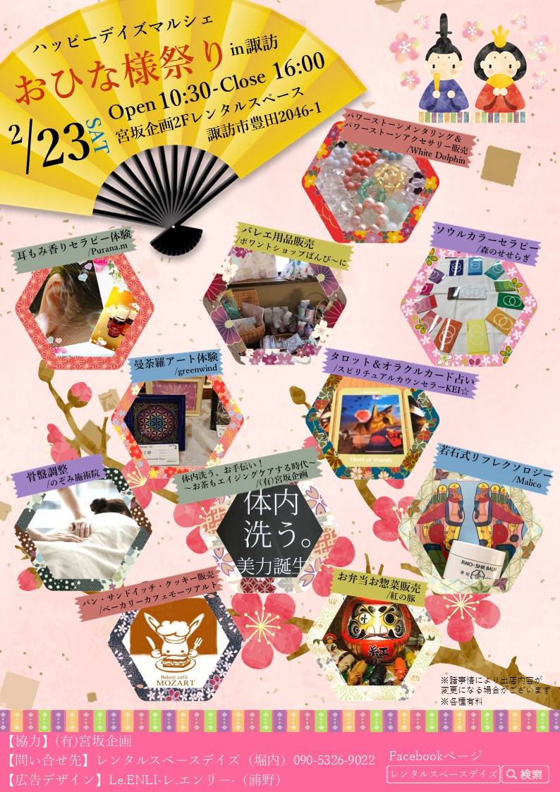 2019 02.23 ハッピーデイズマルシェ おひな様祭りin諏訪 EVENT CLOSED 共有:クリックして Twitter で共有 (新しいウィンドウで開きます)Facebook で共有するにはクリックしてください (新しいウィンドウで開きます)いいね:いいね 読み込み中… Share RSS 関連記事 諏訪交響楽団100周年記念 第176回定期演奏会 みんなで理科実験 バロック音楽で祝う山のクリスマス 初夏のハープコンサート in たてしな日和 お坊さんとスワらナイト トヨタ ガズーレーシング ラリーチャレンジ in八… 春のしもすわ三角八丁〜和装でまち歩き ビューティーバイキング ギャラリー橋田 永遠の華展 展示即売会